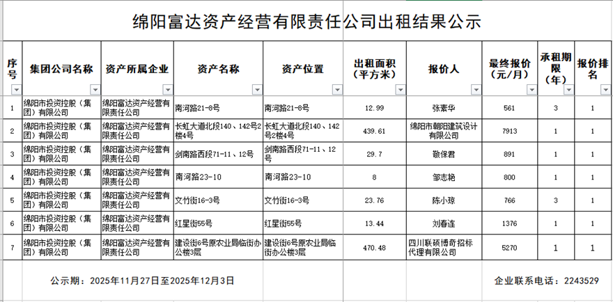 綿陽富達資產(chǎn)經(jīng)營有限責(zé)任公司出租結(jié)果公示