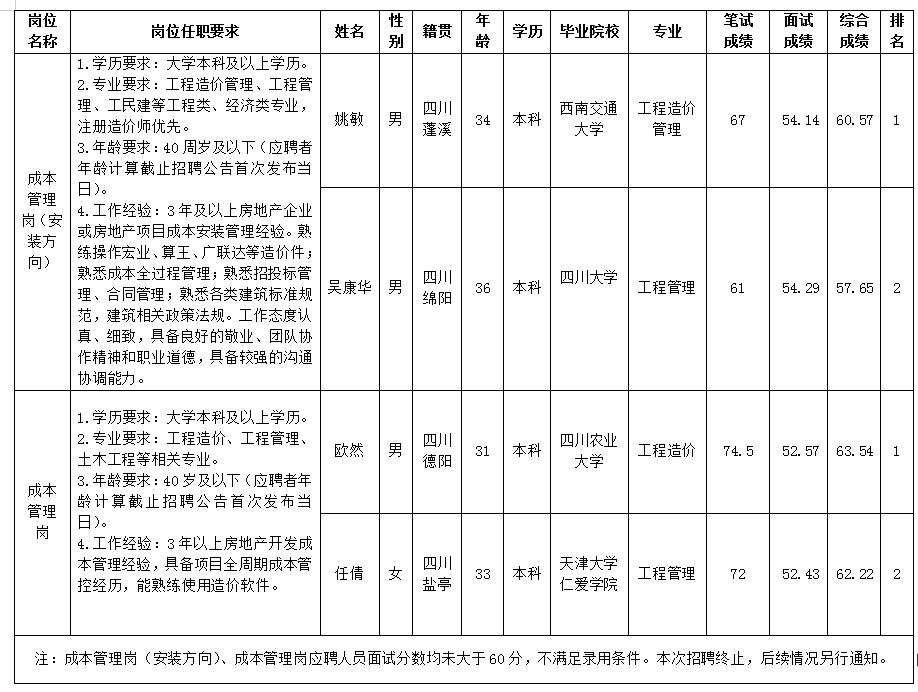 根據(jù)綿陽市綿投置地有限公司發(fā)布的招聘公告及招聘相關(guān)規(guī)定,經(jīng)筆試、面試等程序,現(xiàn)將筆試、面試成績予以公示。