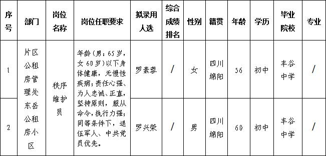 根據(jù)康居公司發(fā)布的長(zhǎng)期招聘一線勤雜人員的招聘公告相關(guān)規(guī)定,經(jīng)面試、體檢等程序,擬錄用羅素蓉、羅興榮同志到綿陽(yáng)市康居房產(chǎn)經(jīng)營(yíng)管理有限公司片區(qū)公租房管理處東岳公租房小區(qū)工作,現(xiàn)予以公示,具體情況如下: