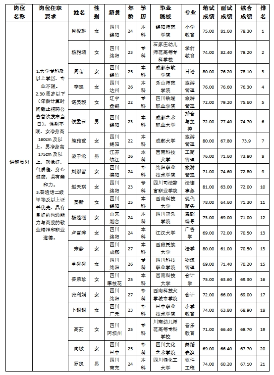 根據(jù)四川越王樓文化傳播有限公司發(fā)布的招聘公告及招聘相關(guān)規(guī)定,經(jīng)筆試、面試等程序,現(xiàn)將筆試(面試)成績(jī)予以公示。