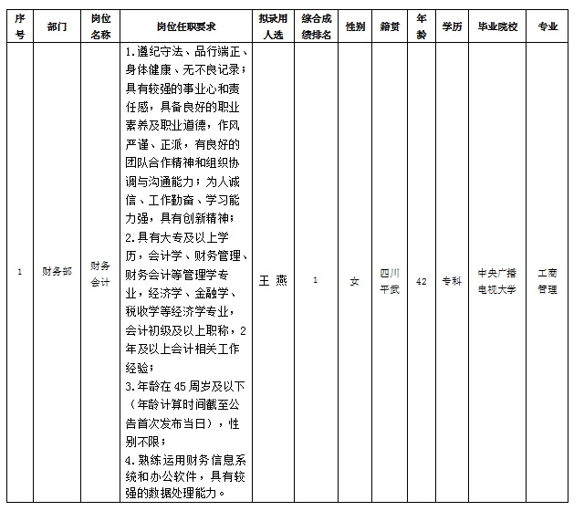 根據綿陽市綿州嘉來會務服務有限公司發(fā)布的招聘公告及招聘相關規(guī)定,經筆試、面試、考察、體檢等程序,擬錄用王燕同志到財務部工作,現(xiàn)予以公示,具體情況如下: