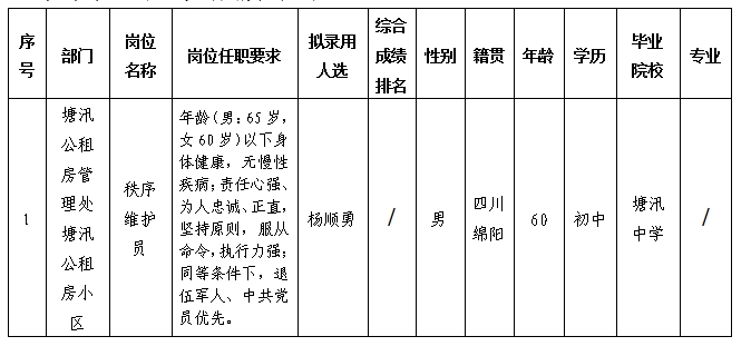 根據(jù)康居公司發(fā)布的長期招聘一線勤雜人員的招聘公告相關(guān)規(guī)定,經(jīng)面試、體檢等程序,擬錄用楊順勇同志到綿陽市康居房產(chǎn)經(jīng)營管理有限公司塘汛公租房管理處塘汛公租房小區(qū)工作,現(xiàn)予以公示,具體情況如下: