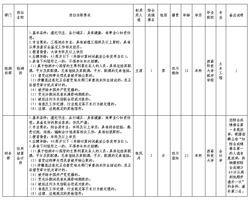 根據(jù)綿陽市建設(shè)工程質(zhì)量檢測(cè)中心有限責(zé)任公司發(fā)布的招聘公告及招聘相關(guān)規(guī)定,經(jīng)筆試、面試、背景調(diào)查、體檢等程序,擬錄用王源等同志到綿陽市建設(shè)工程質(zhì)量檢測(cè)中心有限責(zé)任公司工作,現(xiàn)予以公示,具體情況如下: