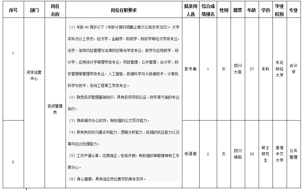 根據(jù)綿陽市投資控股(集團(tuán))有限公司發(fā)布的招聘公告及招聘相關(guān)規(guī)定,經(jīng)筆試、面試、考察、體檢等程序,擬錄用彭書敏等同志到綿陽市投資控股(集團(tuán))有限公司工作,現(xiàn)予以公示,具體情況如下: