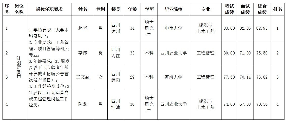 根據(jù)綿陽市綿投置地有限公司發(fā)布的招聘公告及招聘相關(guān)規(guī)定,經(jīng)筆試、面試等程序,現(xiàn)將筆試、面試成績予以公示。