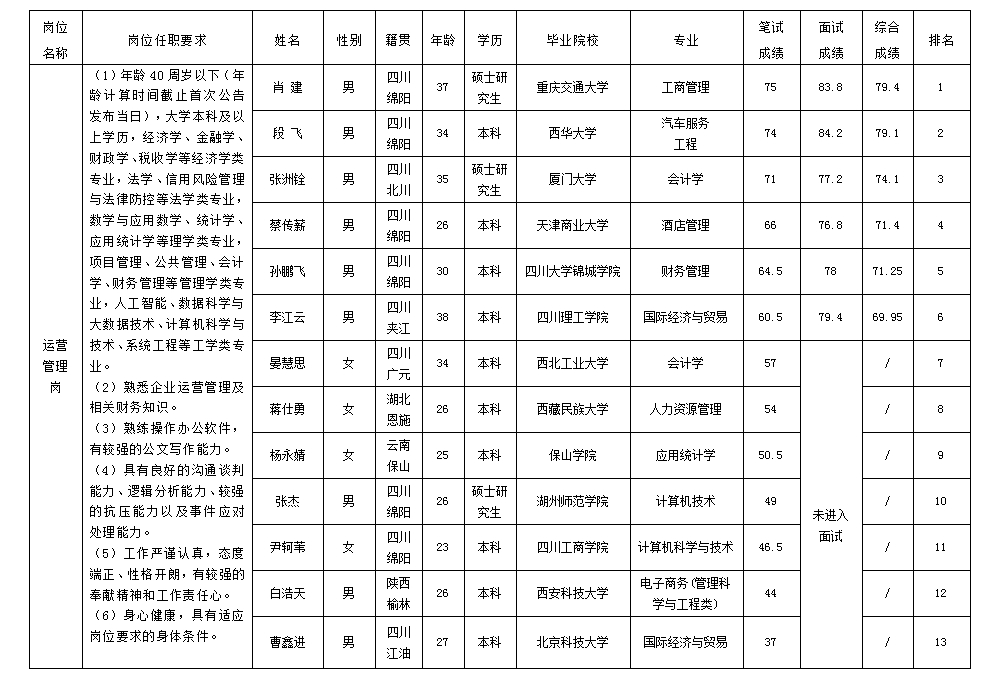 根據(jù)綿陽市投資控股(集團(tuán))有限公司發(fā)布的招聘公告及招聘相關(guān)規(guī)定,經(jīng)筆試、面試等程序,現(xiàn)將筆試(面試)成績予以公示。