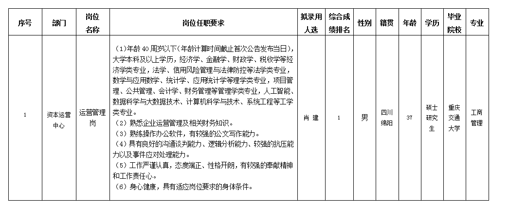 根據(jù)綿陽市投資控股(集團)有限公司發(fā)布的招聘公告及招聘相關(guān)規(guī)定,經(jīng)筆試、面試、考察、體檢等程序,擬錄用肖建同志到綿陽市投資控股(集團)有限公司工作,現(xiàn)予以公示,具體情況如下: