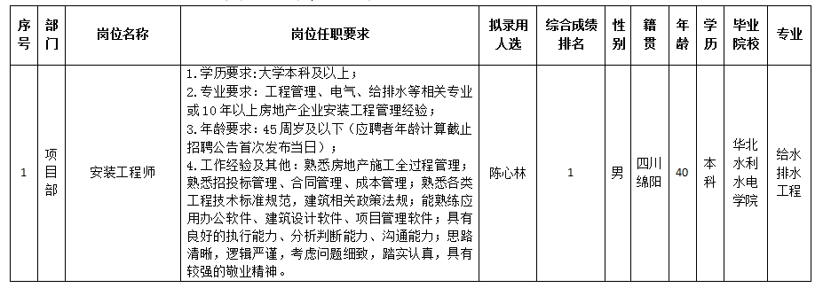 根據(jù)綿陽市綿投置地有限公司發(fā)布的招聘公告及招聘相關規(guī)定,經(jīng)筆試、面試、考察、體檢等程序,擬錄用陳心林同志到綿陽市綿投置地有限公司工作,現(xiàn)予以公示,具體情況如下: