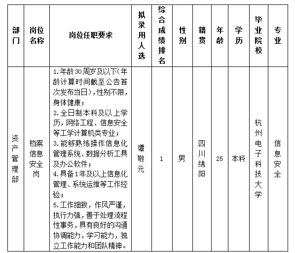 根據(jù)綿陽市綿投商業(yè)運營管理有限責(zé)任公司發(fā)布的招聘公告及招聘相關(guān)規(guī)定,經(jīng)筆試、面試、背景調(diào)查、體檢等程序,擬錄用譚敬元同志到綿陽市綿投商業(yè)運營管理有限責(zé)任公司工作,現(xiàn)予以公示,具體情況如下:
