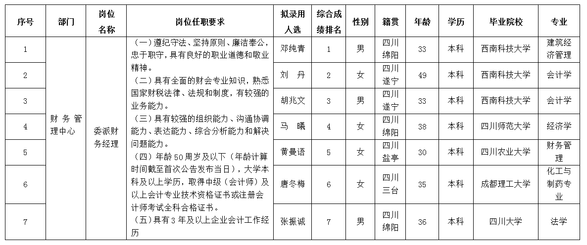根據綿陽市投資控股(集團)有限公司發(fā)布的招聘公告及招聘相關規(guī)定,經筆試、面試、考察等程序,擬錄用鄧純青等同志作為集團委派財務經理崗位擬錄用人員,現予以公示,具體情況如下: