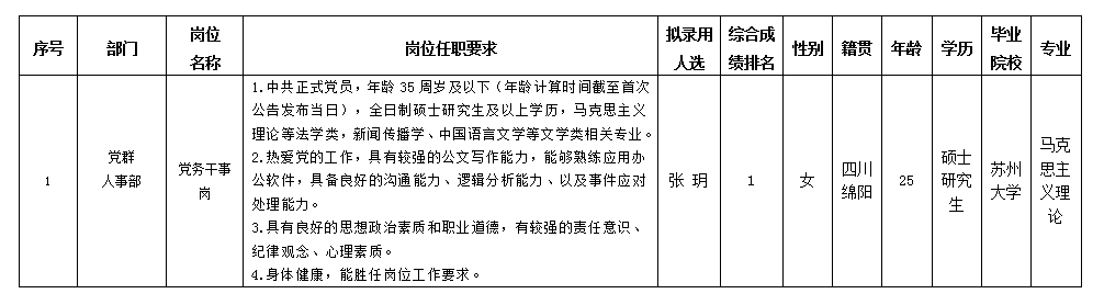 根據(jù)綿陽(yáng)市投資控股(集團(tuán))有限公司發(fā)布的招聘公告及招聘相關(guān)規(guī)定,經(jīng)筆試、面試、背調(diào)、體檢等程序,擬錄用張玥同志到綿陽(yáng)市投資控股(集團(tuán))有限公司工作,現(xiàn)予以公示,具體情況如下: