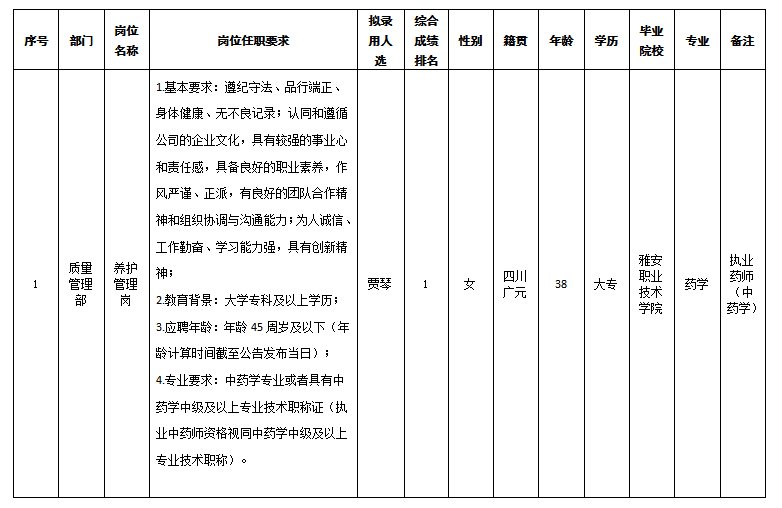 根據(jù)四川嘉來海川醫(yī)療科技有限公司發(fā)布的招聘公告及招聘相關(guān)規(guī)定,經(jīng)筆試、面試、背調(diào)、體檢等程序,擬錄用賈琴同志到四川嘉來海川醫(yī)療科技有限公司工作,現(xiàn)予以公示,具體情況如下: