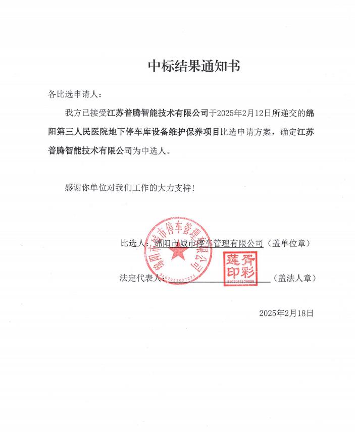 綿陽第三人民醫(yī)院地下停車庫設(shè)備維護保養(yǎng)項目中標(biāo)結(jié)果通知書
