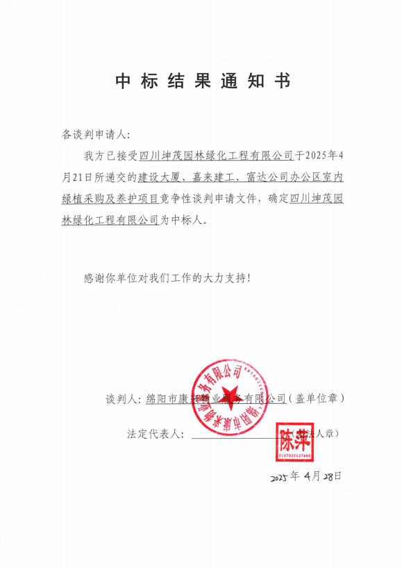 建設(shè)大廈、嘉來建工、富達(dá)公司辦公區(qū)室內(nèi)綠植采購及養(yǎng)護(hù)項(xiàng)目中標(biāo)結(jié)果通知