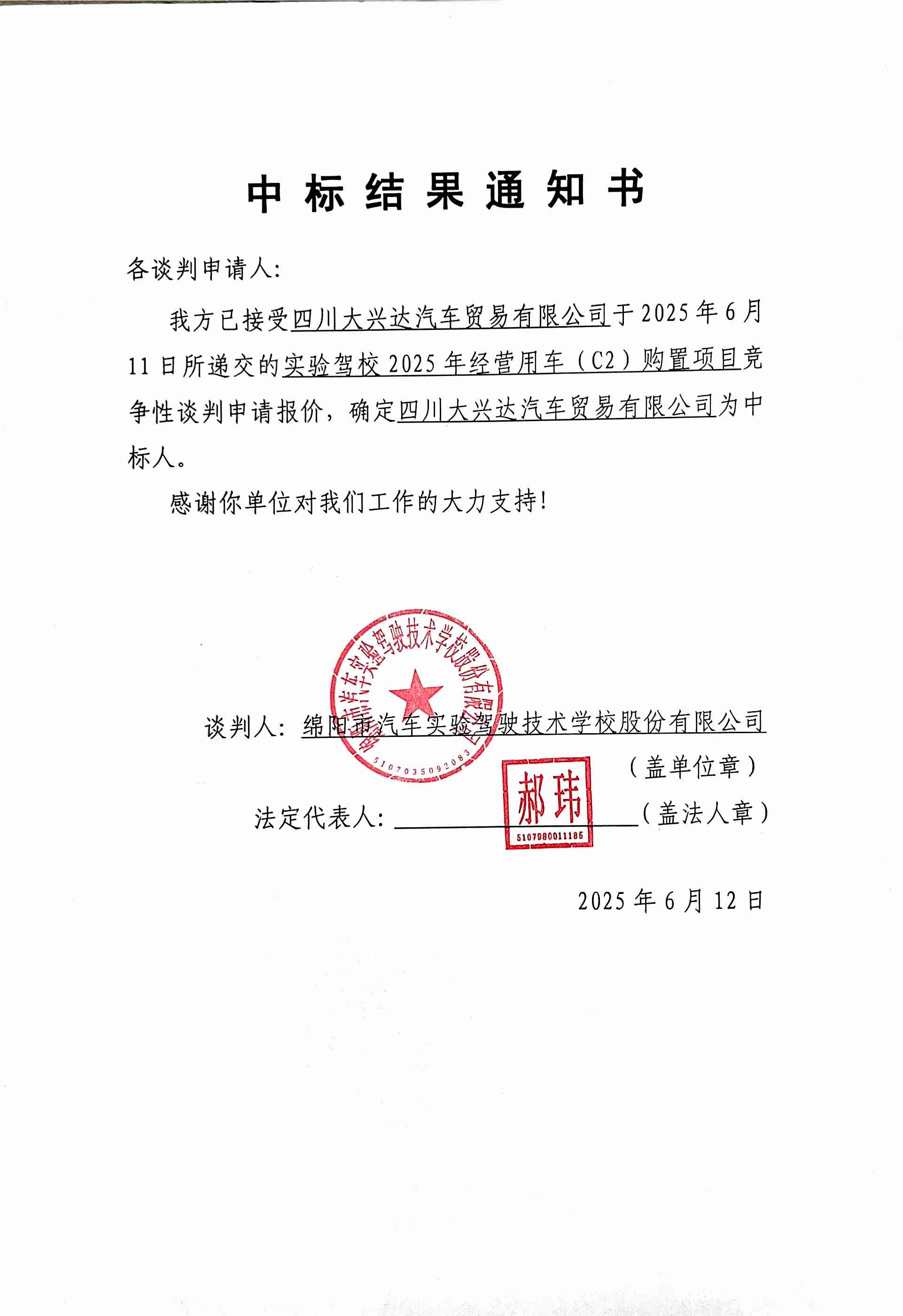 實驗駕校2025年經(jīng)營用車(C2)購置項目中標結(jié)果通知