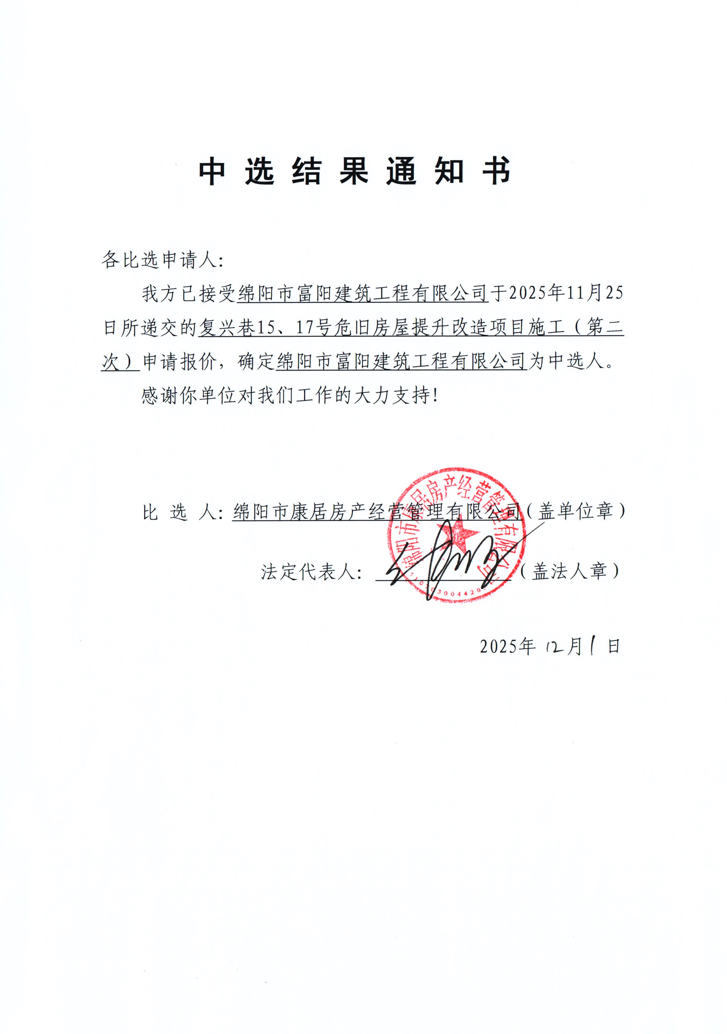 復興巷15、17號危舊房屋提升改造項目施工(第二次)中選結(jié)果通知