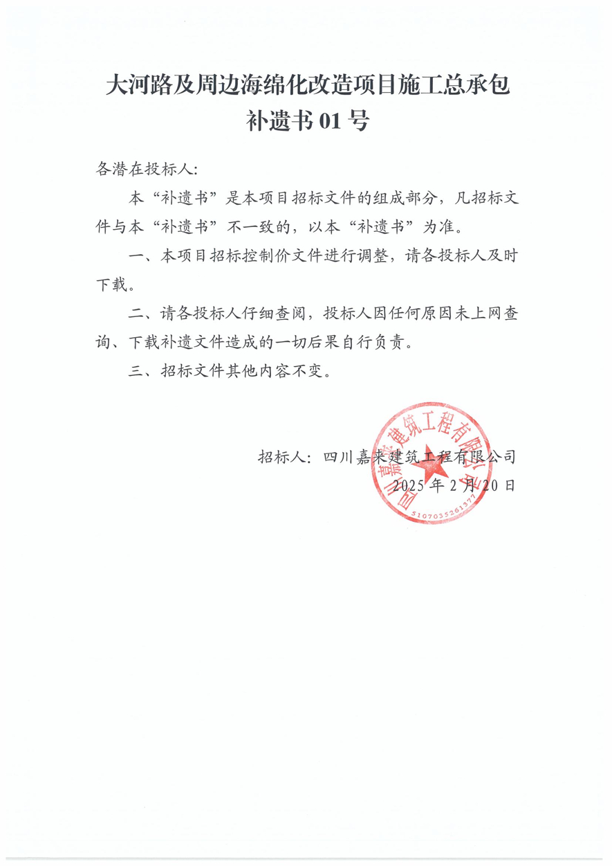 大河路及周邊海綿化改造項(xiàng)目施工總承包補(bǔ)遺書(shū)01號(hào)